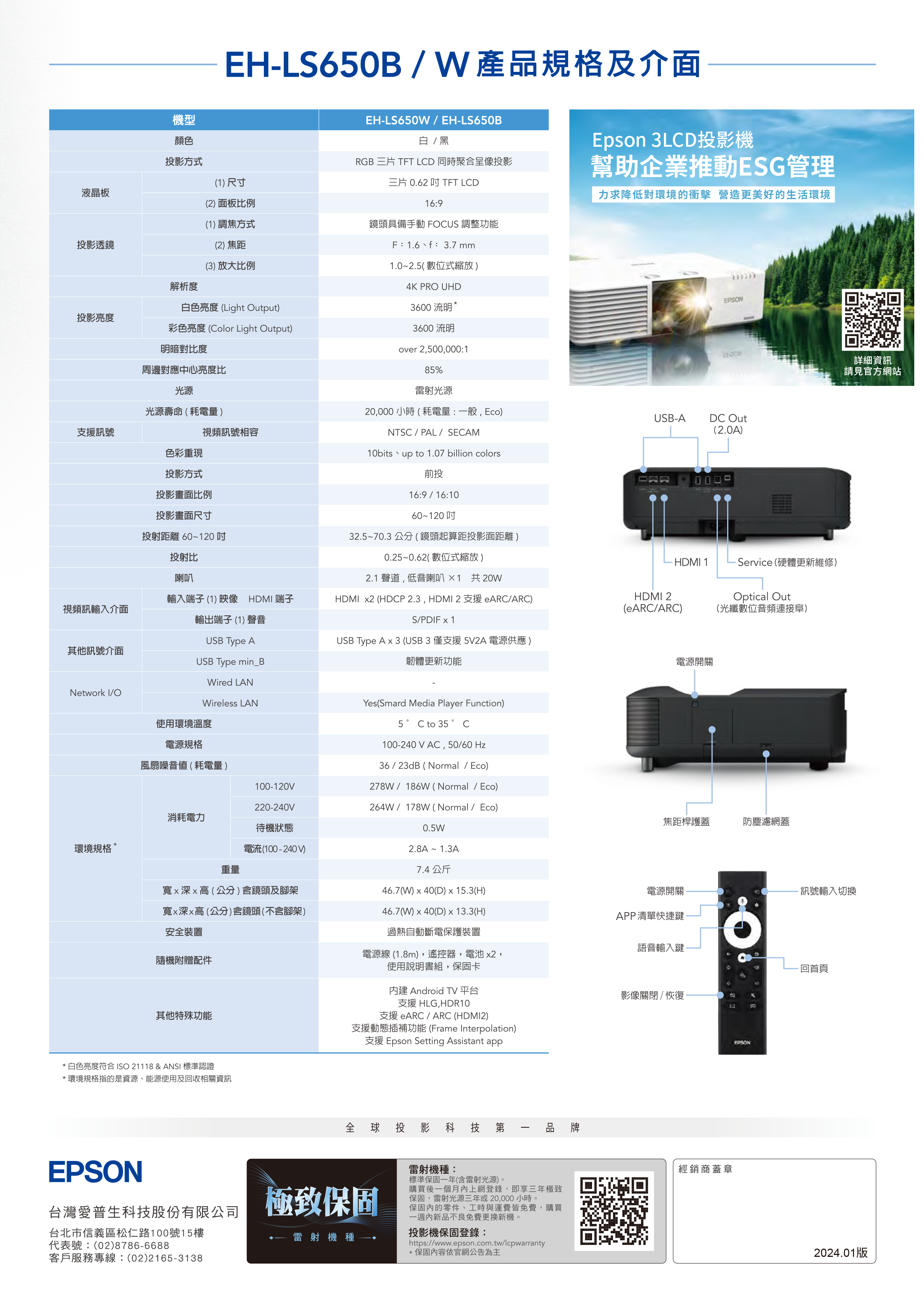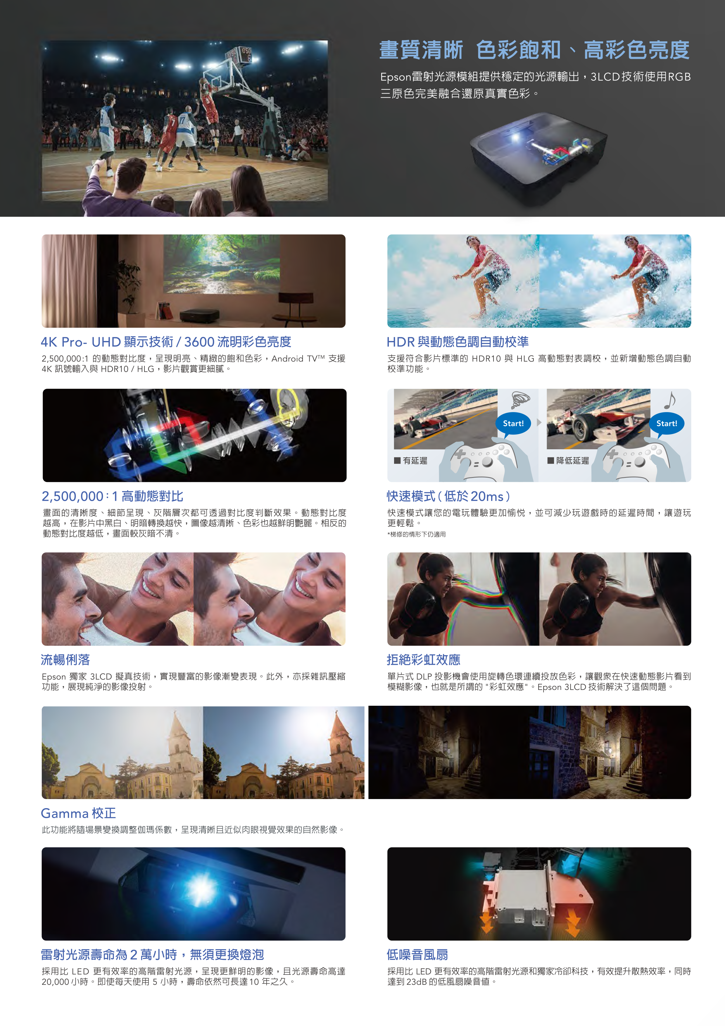 燈泡壽命、投影機規格:20,000 小時投射比範圍、投影機規格:0.25~0.62(數位式縮放)尺寸 - 投影距離、投影機規格:61~120吋色彩重現、投影機規格:10bits、up to 1.07 billion colors投影方式、投影機規格:RGB 三片 TFT LCD 同時聚合呈像投影像素數、投影機規格:Full HD 2,073,600 dots (1920 x 1080) x 3彩色亮度 - 彩色亮度輸出、投影機規格:3600 流明白色亮度 - 白色亮度輸出、投影機規格:3600 流明畫面比例、投影機規格:16:9原生解析度、投影機規格:4K PPO-UHD燈泡類型、投影機規格:Laser Diode支援最高傳送解析度、投影機規格:4K端子輸入、其他家用投影機:HDMI x2 (HDCP 2.3 , HDMI 2 支援eARC/ARC)