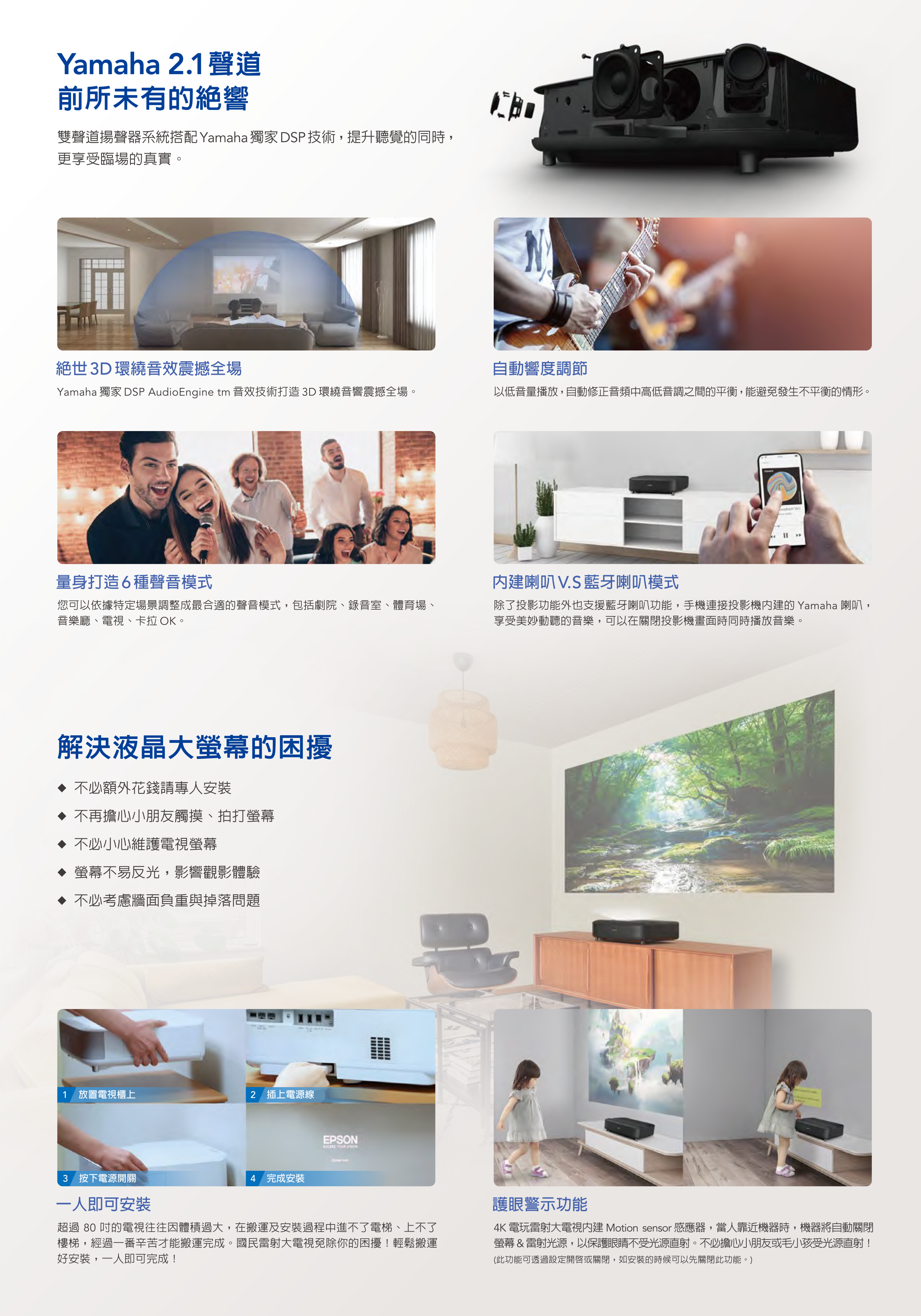 - YAMAHA獨家DSP AudioEngine™,音效技術打造3D環繞音效震撼全場