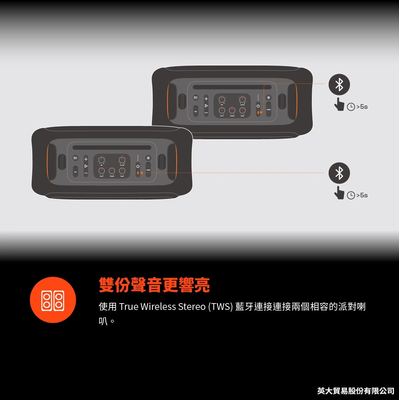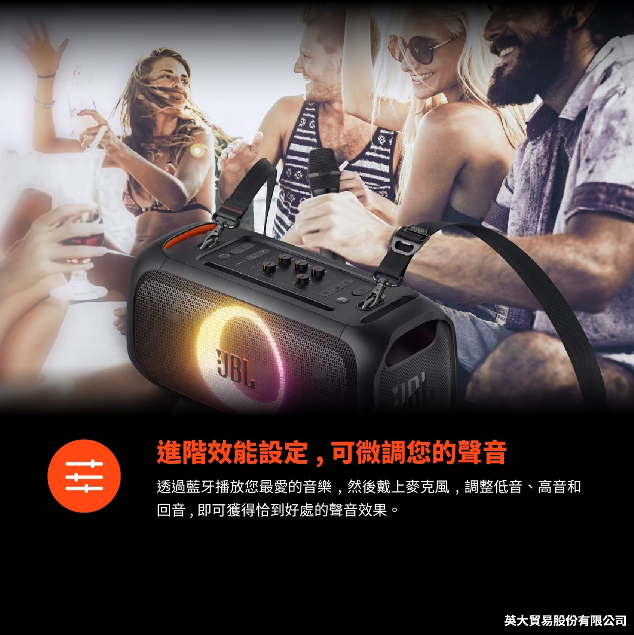 任何地點都能舉行派對 / 動人的 JBL Pro Sound / 同步燈光秀 / 隨附 JBL 無線麥克風 / 進階效能設定