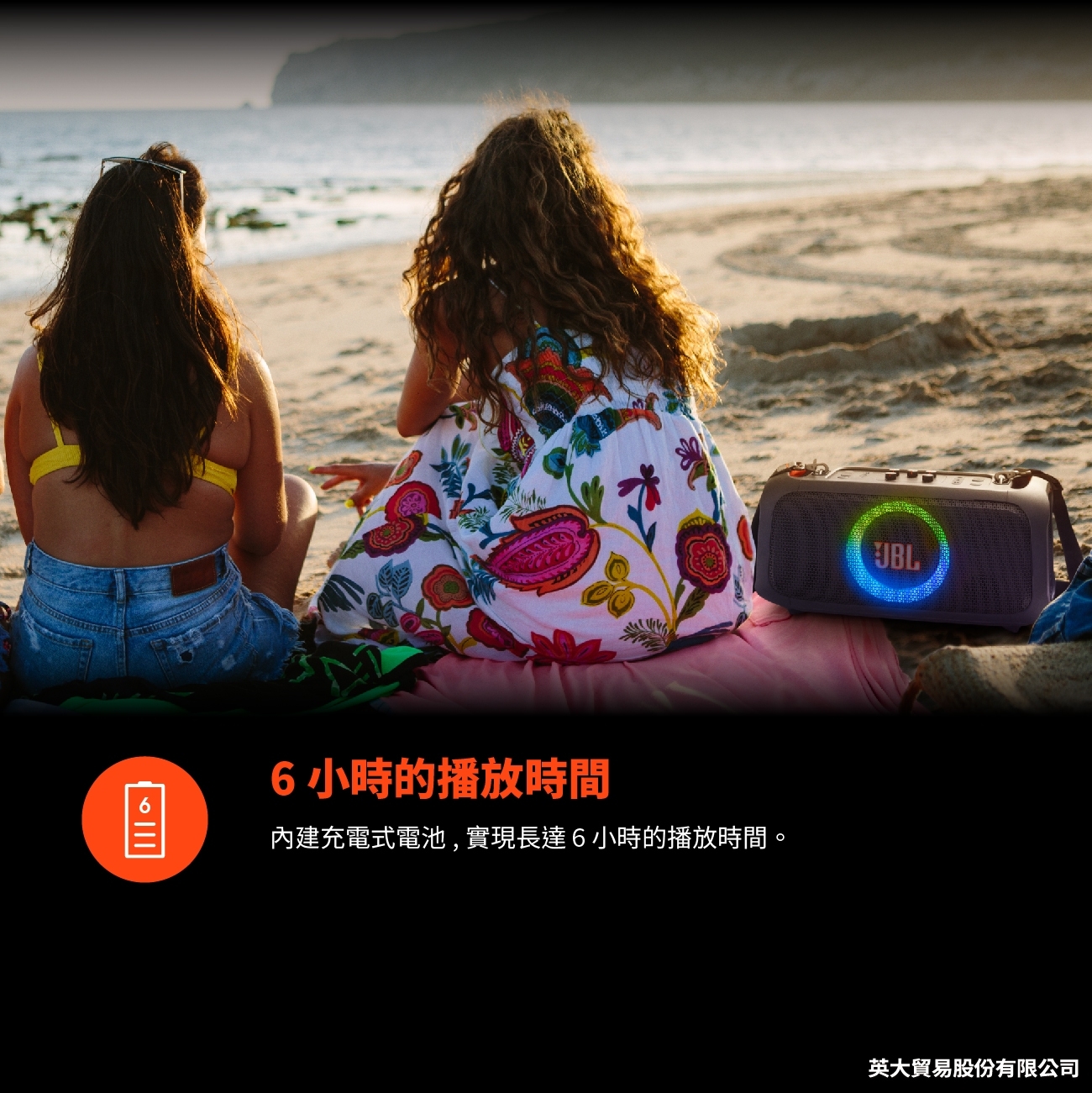 可微調您的聲音 / IPX4 防濺保護 / 方便的肩帶讓派對如影隨行 / 6 小時的播放時間 / 雙份聲音更響亮 / 隨插即用麥克風和吉他輸入 / 流暢的藍牙串流 / 插入您的播放清單