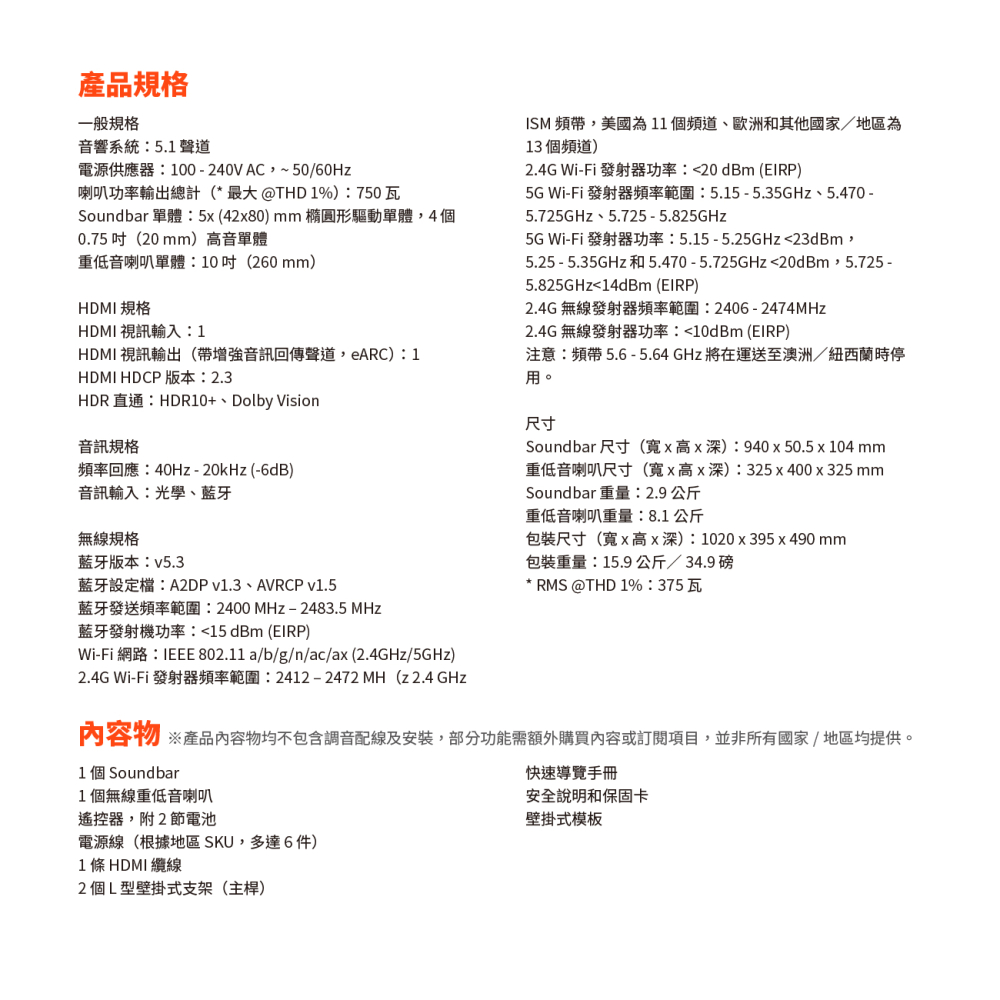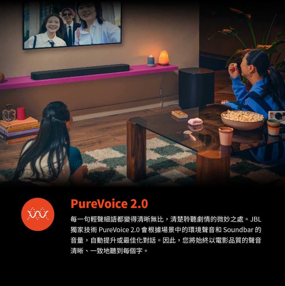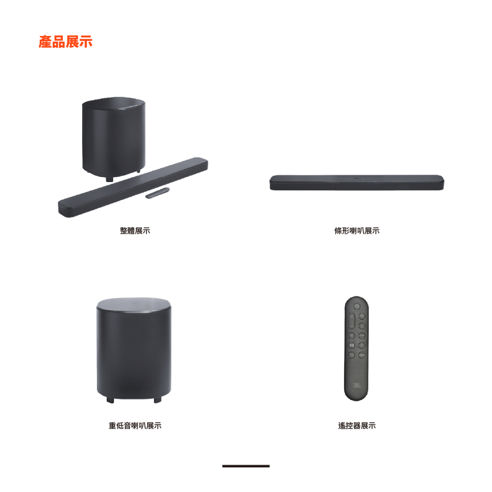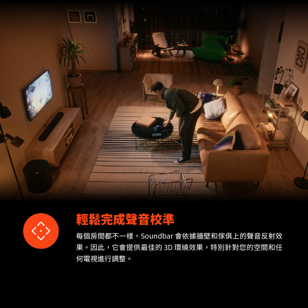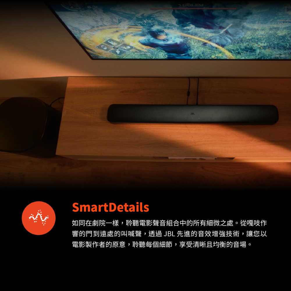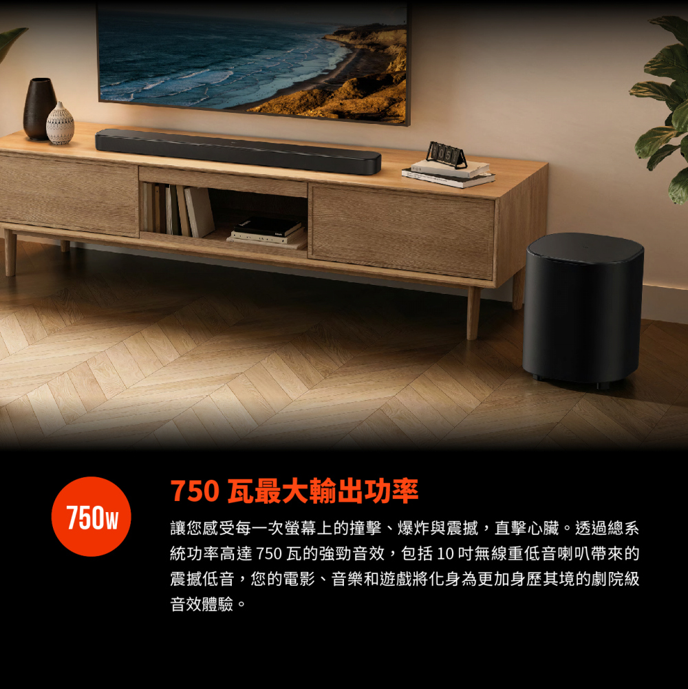 750 瓦最大輸出功率和 10 吋無線重低音喇叭 / Dolby Atmos® / MultiBeam™ 3.0 / PureVoice 2.0 / SmartDetails / 適用於所有生態系統和音樂串流服務 / 輕鬆完成聲音校準 / HDMI eARC 搭載 4K Dolby Vision Passthrough / JBL ONE 應用程式