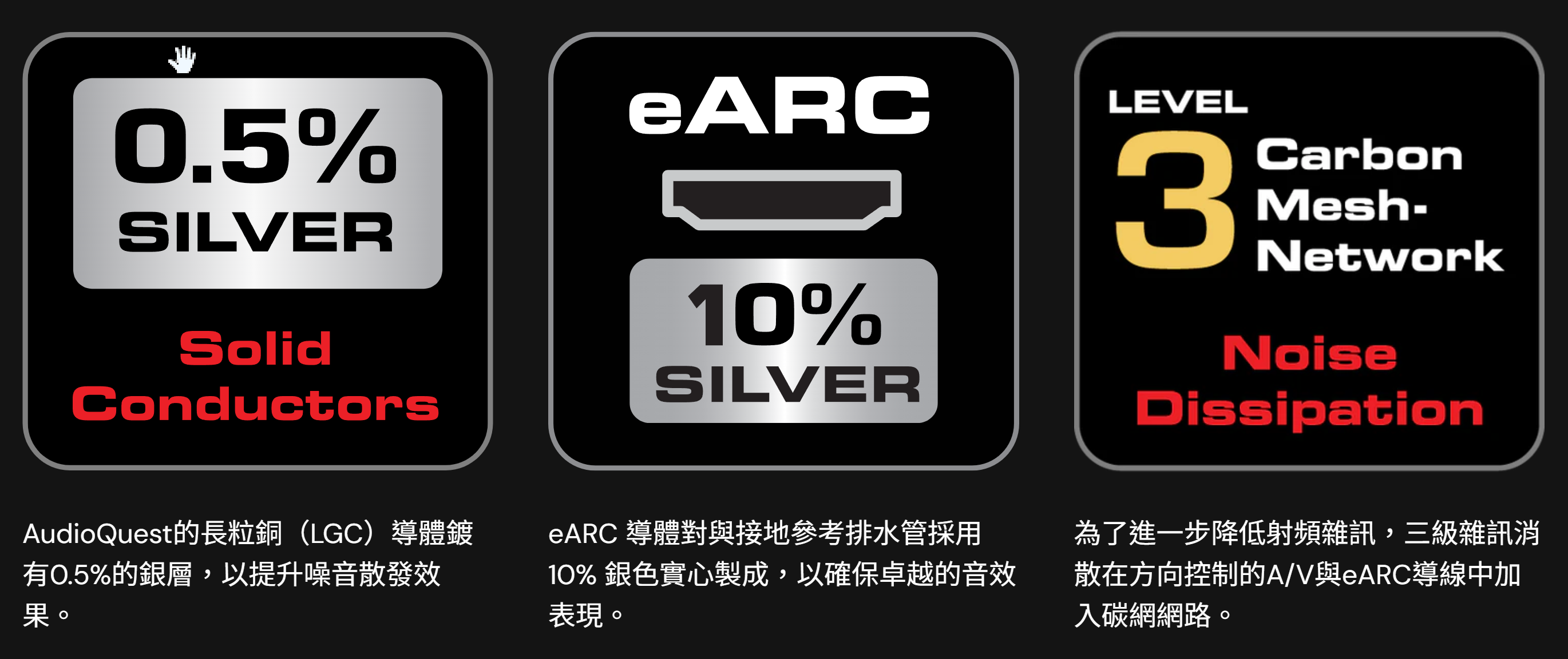 伏特加eARC配備10%銀色eARC導線及5%銀色接地參考導體,具備3級噪音消散。