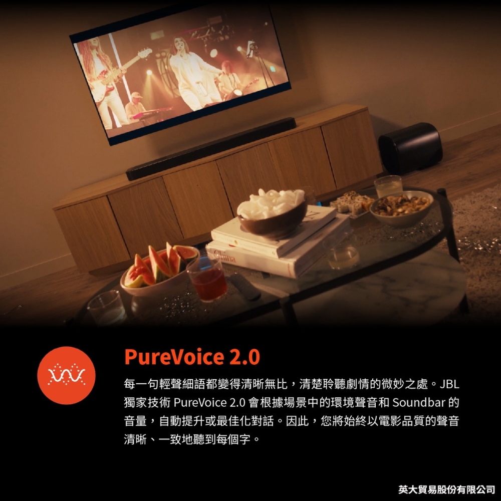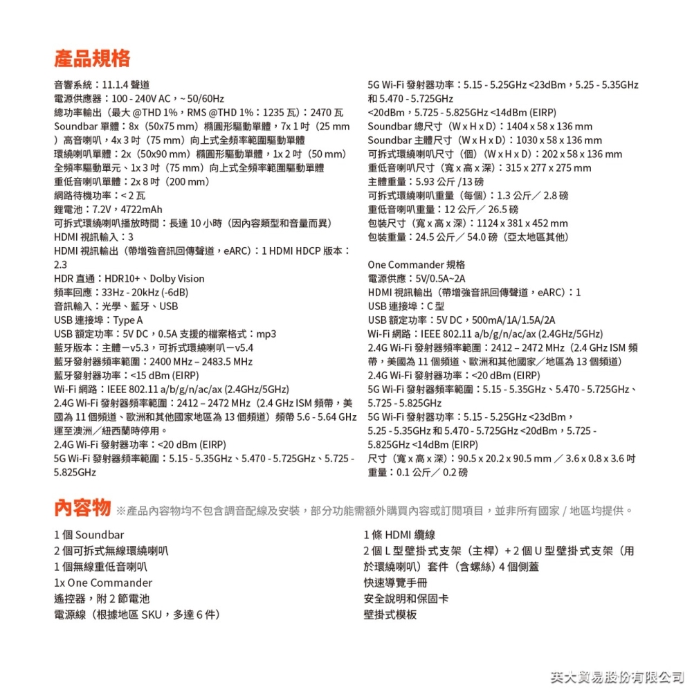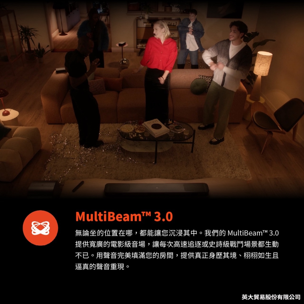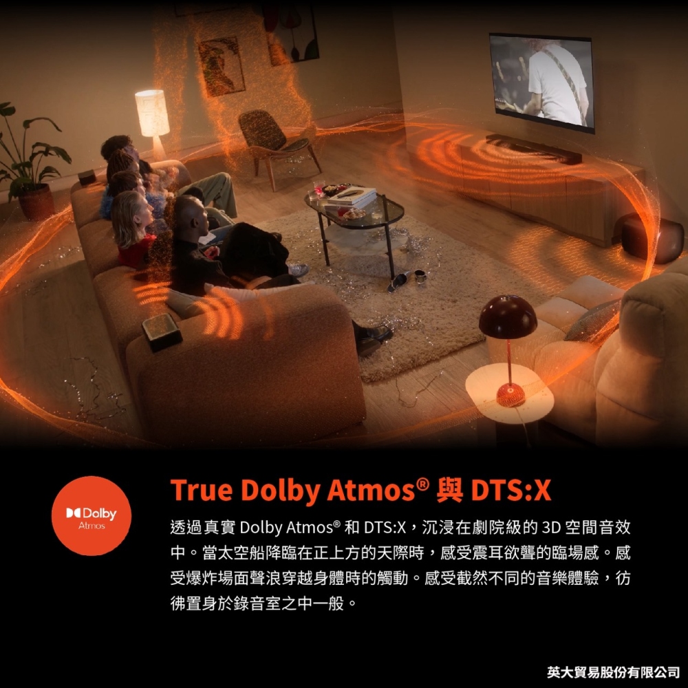 True Dolby Atmos® 與 DTS:X / MultiBeam™ 3.0 / PureVoice 2.0 / SmartDetails / 精巧重低音喇叭中的 AI Sound Boost Bluetooth® 喇叭 / 適用於所有生態系統和音樂串流服務 /JBL ONE 應用程式 / HDMI eARC 搭載