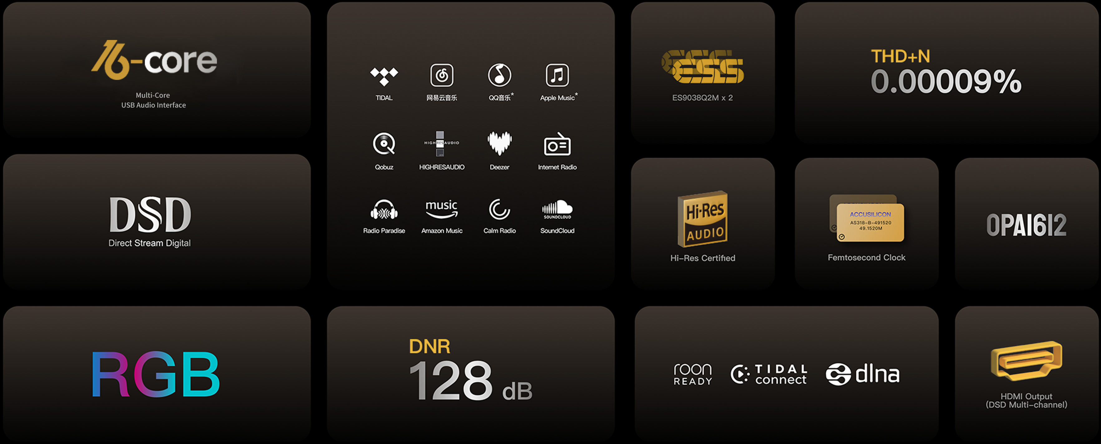 網易雲音樂、QQ音樂*、蘋果音樂*、TIDAL, Qobuz, HIGHRESAUDIO, Amazon Music, IDAGIO, Calm Radio, Internet Radio, TuneIn, Radio Paradise, Deezer, SoundCloud, Presto Music等